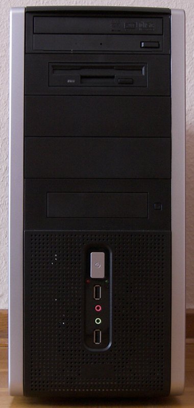 At the end of July 2010 the machine was upgraded with components received from stardust: an AMD Athlon 64 X2 4200+ CPU, an Asrock 939A785GMH/128M motherboard and 4GB Hynix DDR400 memory. The previous setup (AMD Athlon XP 2400+ CPU, MSI KT4V-L V1.0 (MS-6712) motherboard, 2x512MB Corsair TwinX CL2 DDR400 memory, Gigabyte GV-N62256DP2-RH GeForce 6200 256MB AGP, Maxtor DiamondMax Plus 9 120GB 6Y120P0 ATA, Intel PRO/1000 MT PCI and a Soundblaster Live! Value PCI (CT4670)) has been sold. The card reader was found to be defective and binned.